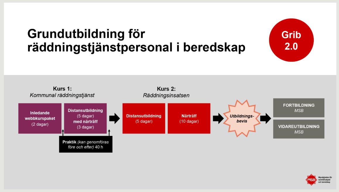 Till att börja går du en introduktion på din station. När du är klar med denna anmäler vi dig till grundutbildning för räddningspersonal i beredskap, förkortat Grib.